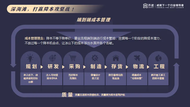 而降本也不等于单纯地降单价,要全流程端到端进行成本管控,挖掘每一个阶段的降成本潜力,不放过每一个降本机会点,让冰山下的成本浮出水面并各个击破。