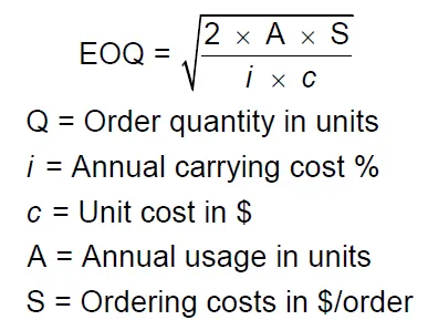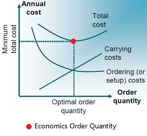 当订货成本等于库存持有成本,总成本达到最低,也就是经济订货量(EOQ)
