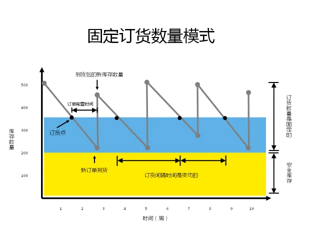 这种模式的原理是,事先设定一个固定的订货数量点,当库存的数量低于这个点,就需要给供应商下新的订单。设定的订货数量点,必须有足够的库存来满足未来的需求,直到下一批订单的到货。