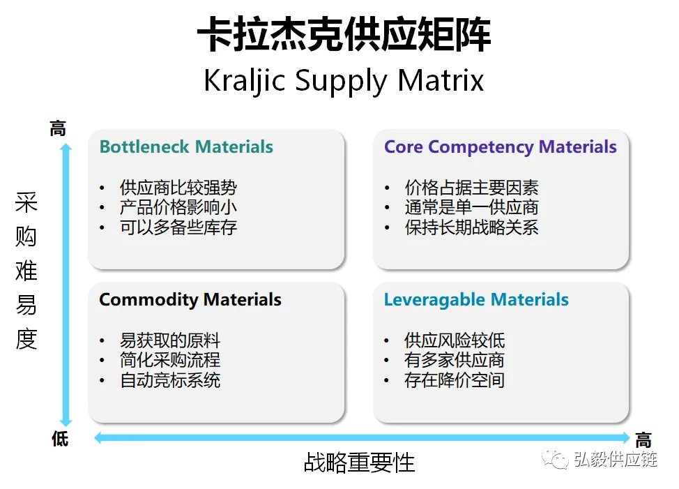 根据商品的独特性,我们可以从商品获取的难易程度和战略重要性,把它们划分为四个象限,这就是著名的卡拉杰克供应矩阵(Kraljic Supply Matrix)。
