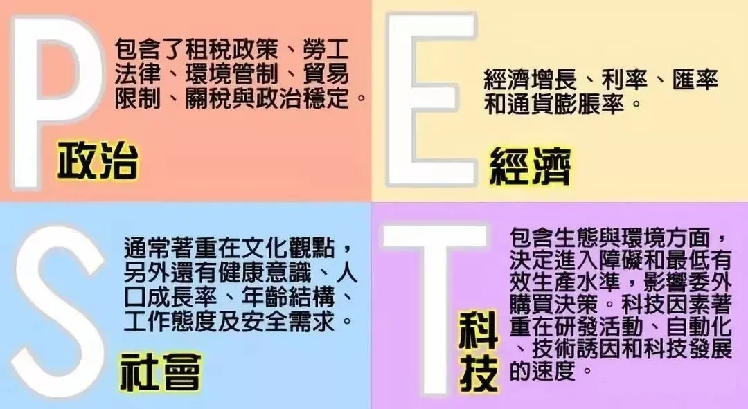 宏观层面的可以用PEST模型进行分析,也就是政治环境、经济形势、社会因素、科技发展。公司层面主要涉及的是合作关系、战略举措、业务规划、各部门协同等方面。