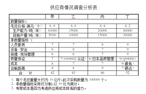 初步选择供应商后,要进行实地考察, 综合考虑材料价格、材料质量、运输费用及其商业信誉等因素,决定谈判对象。该企业到这四家工厂进行了实地考察,把相关因素列成一张表格,其格式如下: