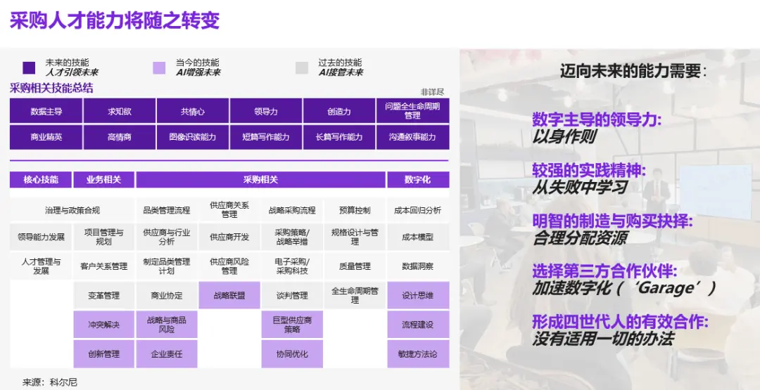 在这个变革的时代,企业的采购人员也需要进行能力迁移。除了传统的采购技能外,他们还需要掌握数据分析、AI应用等新技术,以应对日益复杂的采购环境。