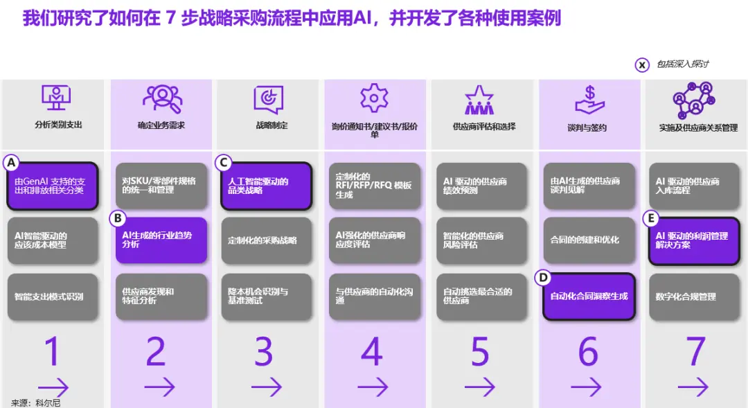 那么企业应该如何运用AI技术?科尔尼将采购分为7个步骤,研究了如何在七步战略采购过程中使用 AI,并曾帮助客户更好的应用这些技术。本文将粗略展开并介绍几个这些步骤中的AI采购应用。
