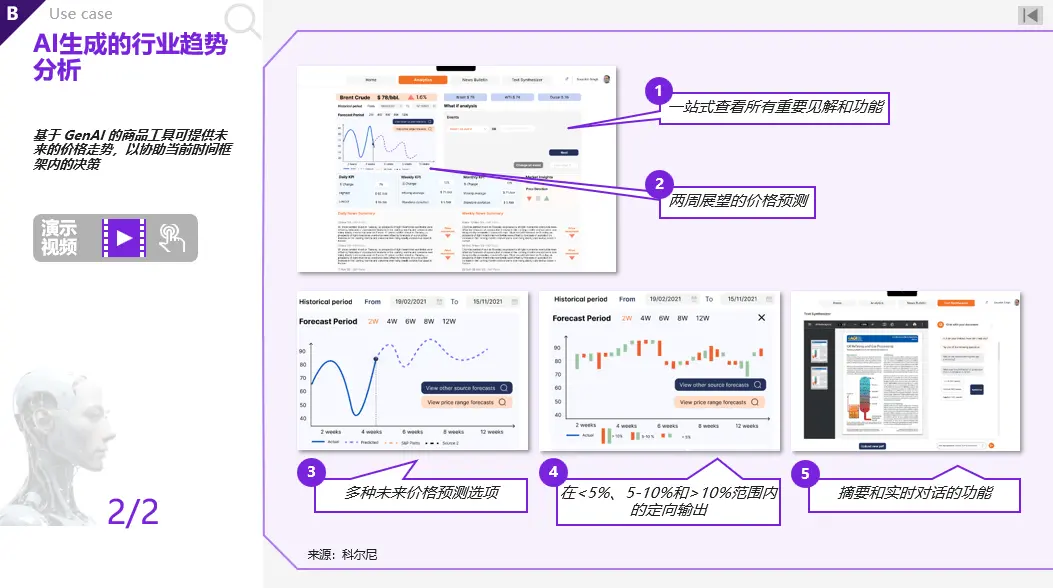通过历史价格和每日新闻趋势、价格走势、以及市场方向性指向等创建管理快报。而后,使用基于 深度学习对未来 2-12 周精确价格预测,得出方向性预测。最后利用 GenAI 进行新闻情绪分析并从文件中获取摘要。