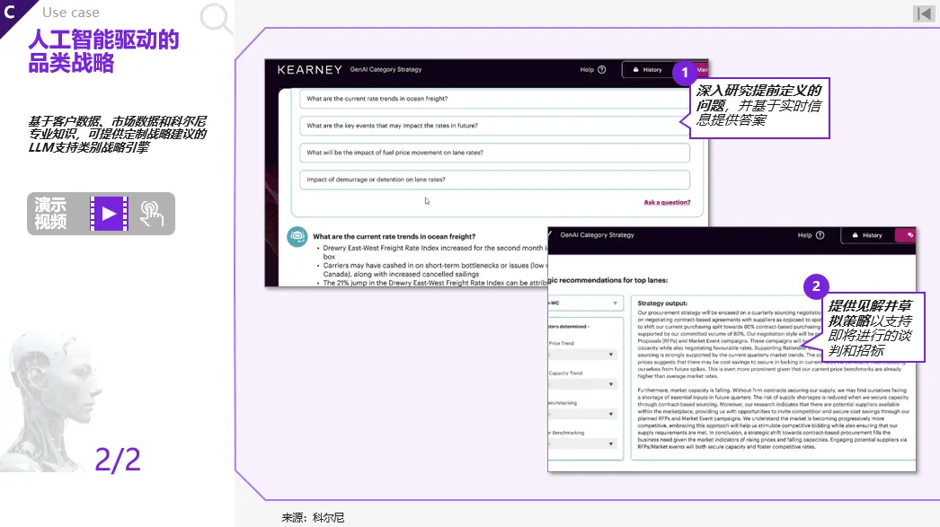 基于客户数据、市场数据和科尔尼专业知识,可定制化由大语言模型引擎支持的品类采购战略建议。众多企业的现有品类战略缺乏对实时信息的整合,而不断增加的数据量(内部和外部数据)使全面整合成为一项难以由人类独立完成的任务。在当前的品类采购战略对数据的利用有限的情况下,企业可以在此层面进一步增强