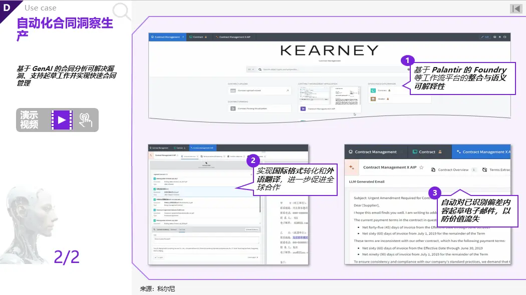而通过将合同和相关文件(框架协议、价格表等)导入大语言模型以实现快速简便的搜索。而后使用 GenAI 提取相关的合同条款,并与交易进行比较,发现遗漏问题。最后通过自动化警报,提示大语言模型起草对相应问题的解决方案。
