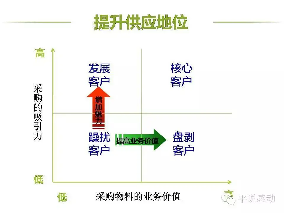 分析已经合作的供需关系,如果发现自己处在不利位置,也同样需要想办法提升自己的地位。提升地位的方法分为两个方向:提升自己对供应商的吸引力(媳妇儿太强势,就心甘情愿地做个好老公);另外一方面就是提升业务量(量的提升很难做到,就尽量集中采购,搭配采购等等)。下面2副图,可以形象表达出如何提升地位: