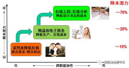 总结起来,这就是供应链降本的三个台阶:谈判降价、流程优化、设计优化。谈判降价最容易,但影响的产品成本最小,大致能影响产品成本的10%左右;流程优化,不管是生产流程还是交易流程,都比较困难,能影响到产品成本的20%左右;设计优化最困难,不管是价值工程,还是价值分析,都需要营销、研发、供应链的跨职能协作,但影响最大——70%左右的成本由设计阶段决定。我们的挑战呢,就是推动跨职能协作,向更高的降本台阶迈进。