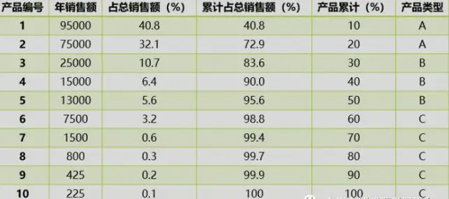 一般而言,A类产品占总销售额60-80%,品种数占全部产品5-15%;B类产品占总销售额15-25%,品种数占全部产品的15-25%;其余的为C类产品。