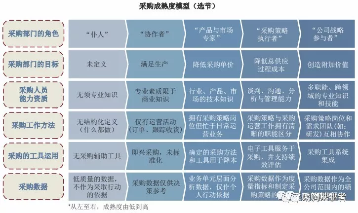 上图可见,处于领先地位的采购组织,往往己从一个被动、垂直的购买服务行政职能转化为具有高度综合性、主动性的战略职能。