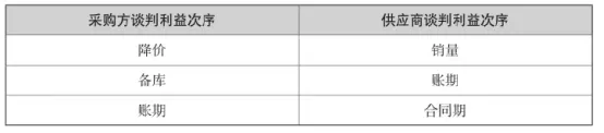 例如,在某场采购谈判中,双方的谈判利益次序表如下表所示。采购人员可以通过延长合同期限或增加标的物范围等方式,从时间和种类等维度增加采购额,从而增加供应商的销量,以换取更低的采购价格或让供应商同意自备一定的安全库存。采购人员还可以提出缩短账期,以换取供应商降价或备库。总之,只要是供应商想要获得的利益,就可以用来交换。