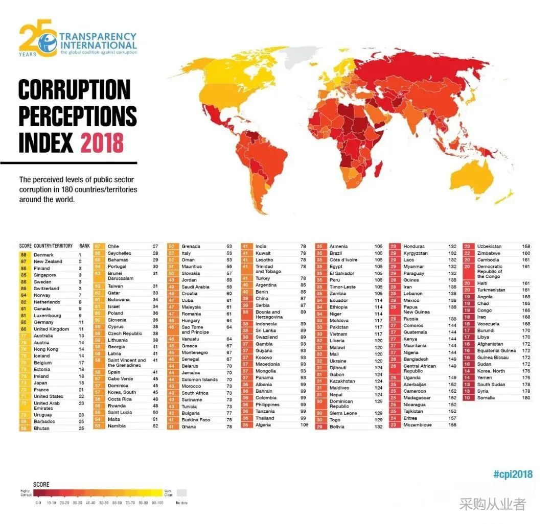 2018年世界贪污腐败指数,颜色越淡,表示越廉洁,反之,越腐败。