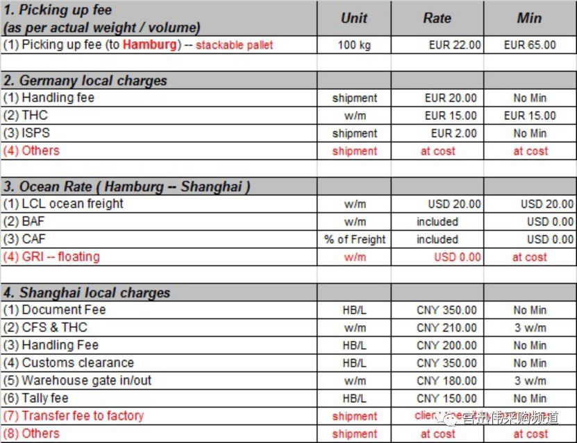 我们再举一个例子,以国际海运物流成本为例,从欧洲供应商仓库大门到中国工厂的跨越大洋运输费用都可以算清楚,为什么一个小零件的成本就算不清楚呢?以下是从德国出货,经由汉堡港出港,到达上海的全程散货海运报价。