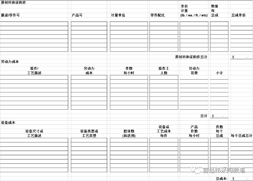 用报价Breakdown分解,给大家举一个例子。最常见的零件报价单里,应该体现出以下这些内容: