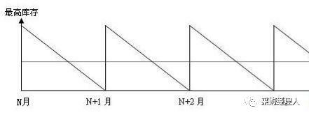 假设企业对一种物料的需求是均匀的、不变的,物料的采购提前期是一个月,不考虑安全库存和物料交付的意外情况,企业的库存水平及消耗曲线如下: