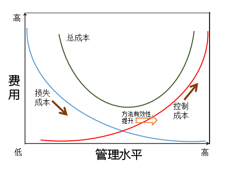 在图1中企业还可以考虑通过管理方法的改进,用更经济的方法实现高效的管理水平,例如供应商整合、共同成本降低、采购方法改进等。图中显示的是“控制成本”曲线的右移。