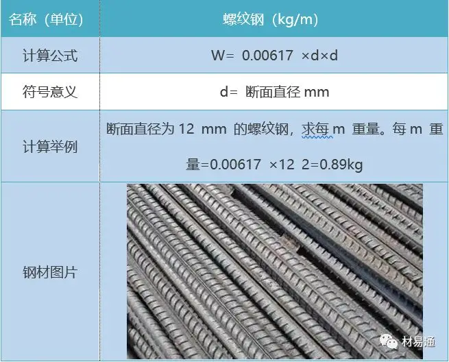 螺纹钢重量(公斤)=0.00617×计算直径×计算直径×长度 |