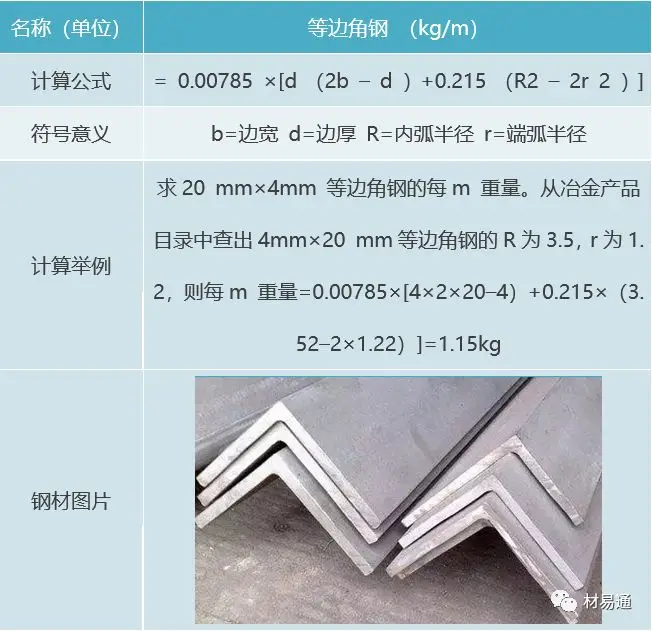 角钢=边长*边厚*0.015 |