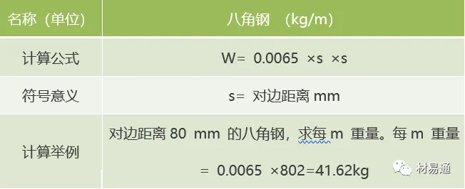八角钢=对边×对边距离×0.0065 |
