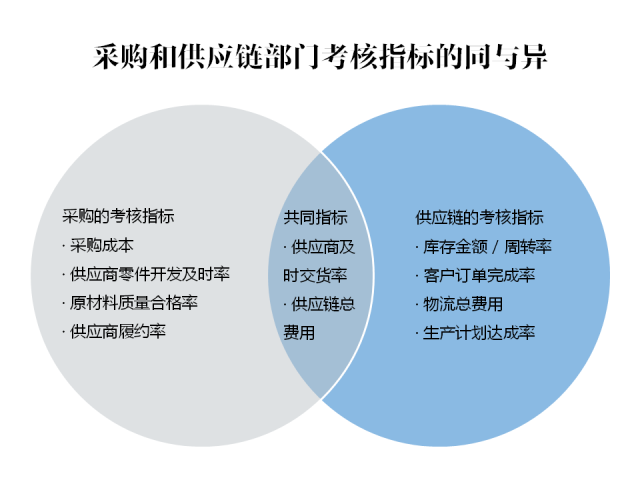 采购和供应链部门的共同考核指标是供应商及时交货率和供应链运营总成本。