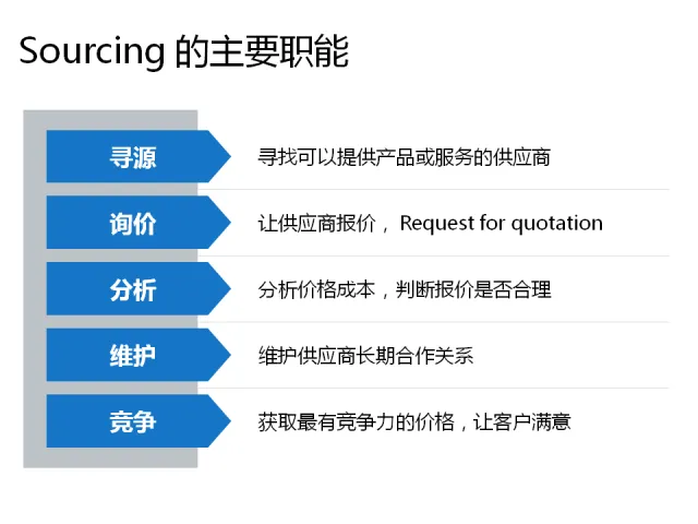 Sourcing也被称为战略采购,有着这么几个方面的职能: