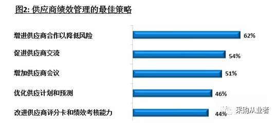 Ardent Partners的研究表明,38%的首席采购官相信与供应商的良好合作将有助于提高公司的绩效水平。尽管存在这样的机会,企业对供应商管理的投资依然很少,因此很多企业的供应商管理能力还比较滞后。图一可以看出,60%的企业跟供应商合作良好,32%的企业有积极的供应链风险管理计划,29%的企业有供应商绩效考核,只有20%的企业有提高供应商绩效和促进供应商创新的举措。