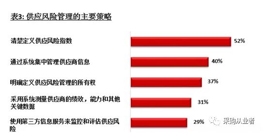 供应商绩效管理的另一面是风险管理。 供应商可能表现良好,但也可能会带来风险。Ardent Partners将供应风险管理定义为用于识别、定义、量化、规避和管理潜在供应风险的程序或一系列策略,以及由此对企业产生的影响。对大多数企业而言,供应风险管理仍然相对初级,52%的企业把关注放在如何定义风险的指数和参数,而40%的企业会对供应商信息进行集中管理。