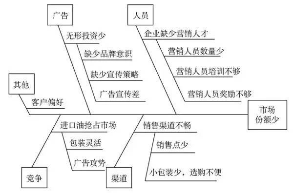 即人员、渠道、广告、竞争和其它。在每一类中包括若干造成这些原因的可能因素,如营销人员数量少、销售点少、缺少宣传策略、进口油广告攻势等。