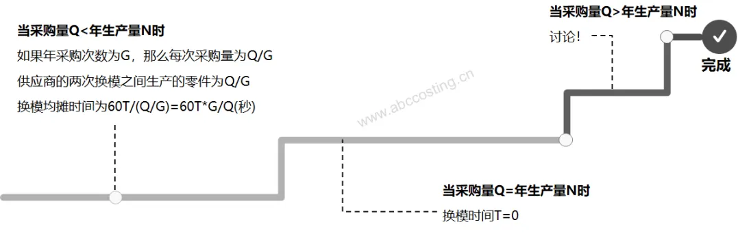 当采购量Q超过年生产量N的时候, 这种情况下就需要单独讨论了。此时可能会需要一些额外的产线投资,那么固定成本就会上升,之前所使用的系数也会需要进行调整。