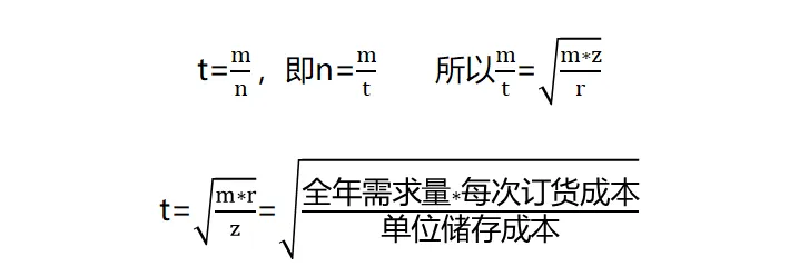全年需求量=m; 每次订货成本=r; 单位储存成本=z; 采购次数=n; 最优采购量=t