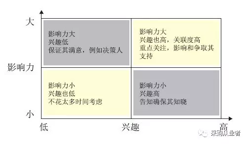 对该图,可以从各利益相关方与项目的关联程度、反馈速度、态度,项目的成功与否对其的影响来判断其对项目的感兴趣程度。而各方对项目的决定权、职责、职位、团队中的角色(是否是key player)等因素可以大致判断其对项目的影响力大小。另外,采购人员还会利用checklist来进一步区分哪些人愿意接受改变,是支持项目的关键性人物,也是进行争取的切入点。这其中的判断因素包括:合作度、反馈速度、对结果的预期、平时对采购工作的支持等。当然了,采购人员平时工作当中积累的经验以及其对企业的了解也会在判断中起到不可忽视的作用。