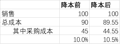 举个例子,假设公司采购成本占总成本的50%,利润率是10%,综合采购成本每降低1%,可以增加0.5%利润率,这就是采购的杠杆作用,要知道,0.5%的利润率很有可能决定了一个企业能否存活下去。