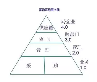 采购系统从低到高可以分为4个层级,业务层级、管理层级、跨部门协同层级、跨企业供应链协作层级。见下图: