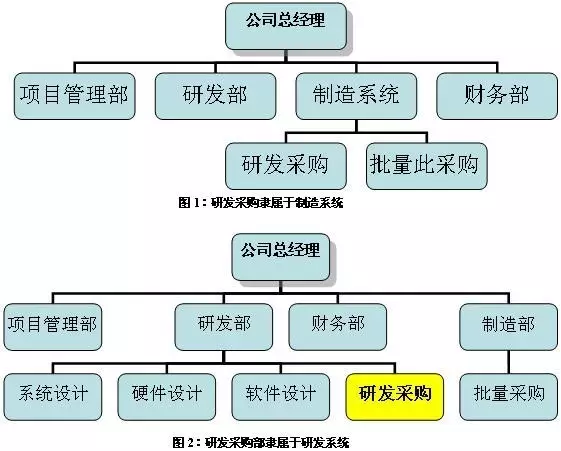我们先来看看研发采购在组织架构中的位置(业界常见的两种),图1和图2: