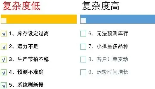 还有一些其他因素也会导致库存出现,如产销协同决策机制失调、无法预测未来库存、小批量多品种、安全库存设定过于保守、系统刷新太慢都会造成库存不准或库存过高的问题。