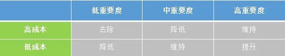 以三星级酒店的浴缸为例,由于担心卫生问题,客户一般都不敢用,实际上这个浴缸对客户而言是可有可无的(重要度低),但酒店却付出了空间成本、购买成本、安装成本和定期清洗的成本(成本高)。