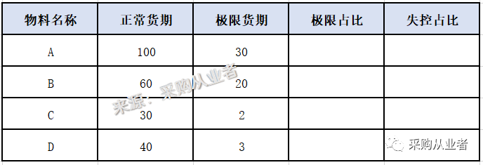 解决这些问题其实并不难,我们在项目之初,由采购部给技术部、生产部及项目部等相关内部客户提供采购件的两个货期,(见附表)一个是正常货期,就是根据供应商产能、库存、物流实际状况估算与对接后,得出的正常排产货期,此为“饭”,是内部使用部门正常需要遵守的货期。另一个是极限货期,就是调用高层对接、现场催办、调用库存等一切非常规措施而实现的最短货期,此为“药”,专门救急而用,但不可常用,否则对于供应商关系维护及成本控制都是极为不利的。