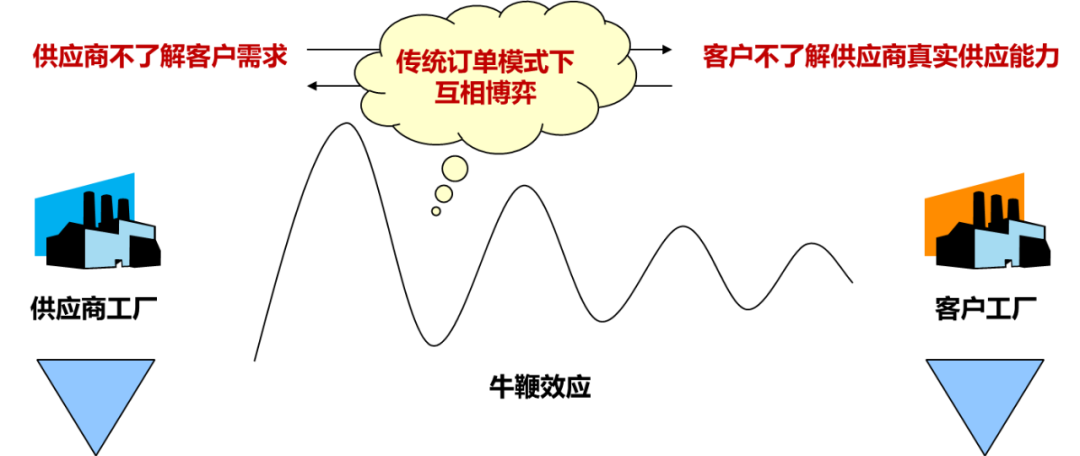 传统订单模式:主要的痛点是供需双方的信息不对称。供应商往往从客户的订单趋势来判断客户的需求趋势,但很有可能客户的订单只不过是补充安全库存,而非真正的客户需求。相应的,客户也不清楚供应商的供货能力,为了防止供应商可能出现的交付不及时情况,而虚高订单时间和数量。由此造成许多库存,加班生产和物流成本的浪费。