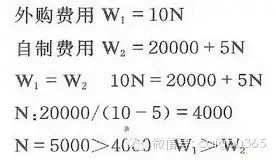 如:某厂生产一种产品,由于设备能力不足,某种零件需外购解决,每只单价10元。如果自制需要增加设备,假定每年需增加固定费用20000元。自制时,估计该零件的单位可变费用为每只5元。该厂全年需此零件5000只,试问是外购还是自制该零件?
