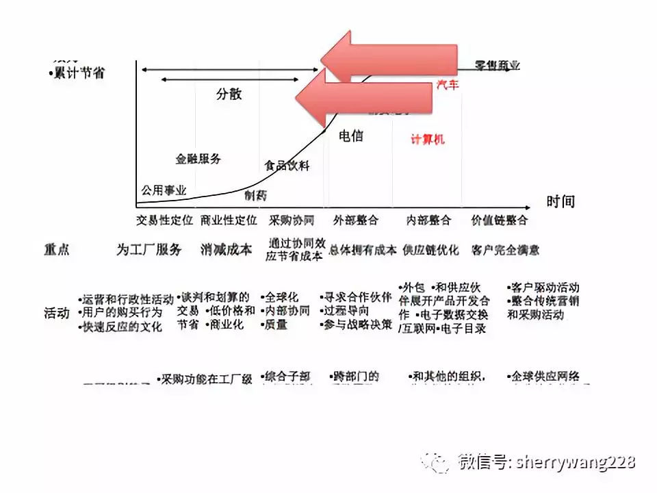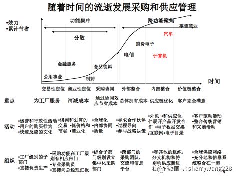 我用他的图为基础,根据多年工作和授课的随堂调研,给大家看看中国的采购和供应链目前在企业的状况吧。以汽车行业和零售业为例,普遍向左挪移。零售业虽然采销合作紧密,甚至合为一体,但是采购团队普遍认为无需了解制造的产品过程和供应链风险,因为那是那些制造业厂家的事情。而汽车行业以主车厂为带头,普遍比起国外汽车行业的管理概念滞后,成本降跨职能合作和采购的有效价值偏低,且中外合资带来的团队沟通障碍,匮乏透明管理,整体汽车行业采购和供应链从业人员也大批尚未接受专业培训,对于工作的问题头疼医头脚疼医脚,屁股指挥脑袋等缺乏战略部署的事情多有发生。当然行业大量缺乏采购和供应链的专业化高管人才,既懂专业又有管理能力的高管人才匮乏更是主要问题,导致企业战略规划缺乏科学性和合理性,随意性普遍出现。