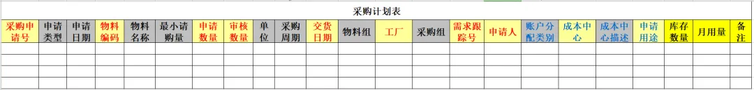 最后,制定采购计划表。将我们上述所有的字段:物资编码(如没有,后期要尽快制定,这有利于实现物料的唯一性身份,是信息化的第一步)、物资名称、最小请购量、采购周期等放入结构化表格中,再预留请购日期、请购数量、审核数量、期望到货时间(交货日期)等字段。完整的静态采购计划表详见下图: