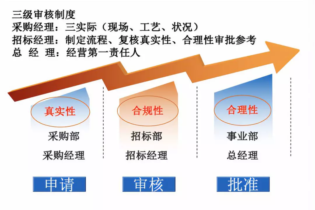 三级审核制度:老板授权的采购部、招标部、事业部实施成本及价格管控。